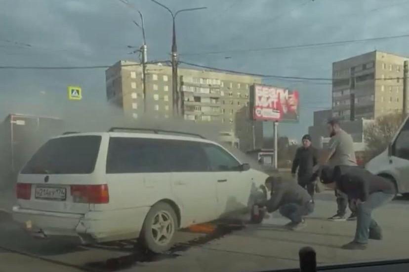 Автомобиль загорелся на оживленном перекрестке в МагнитогорскеМашину тушили очевидцы и МЧС